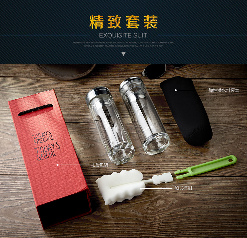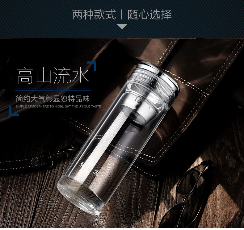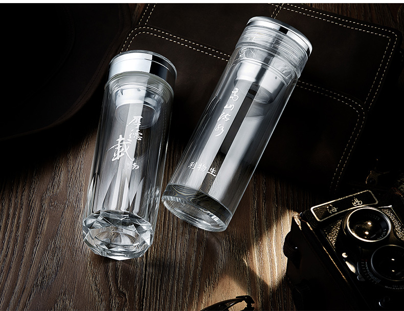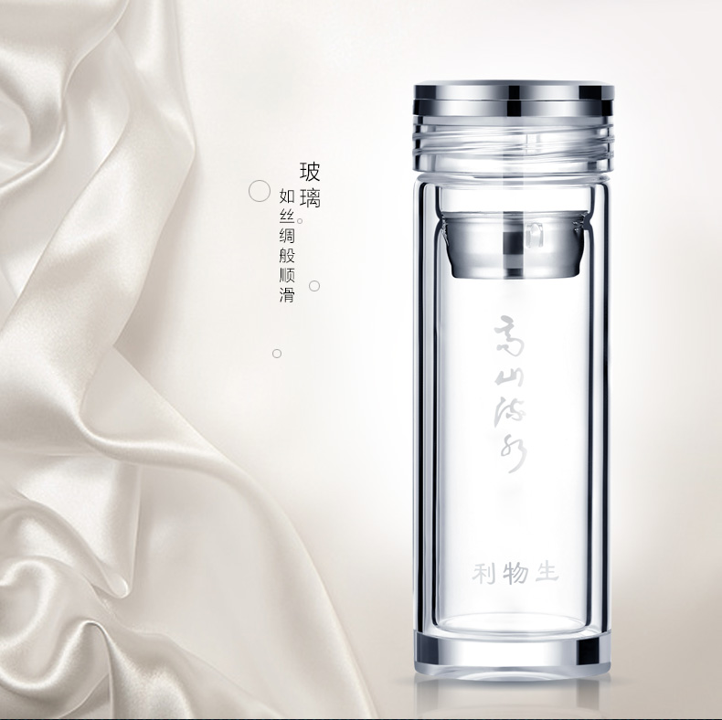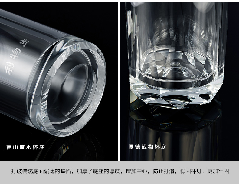 創意雙層水晶高山流水玻璃杯帶蓋茶杯批量訂定制印LOGO